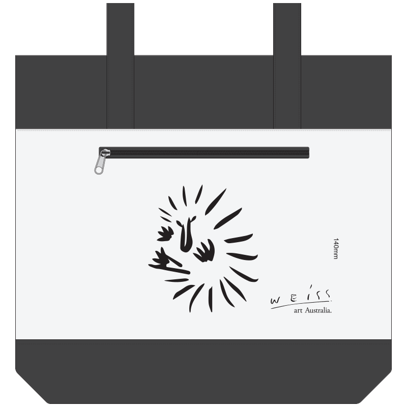 Weiss art Echidna Tote Bag, iconic calligraphy design on a practical beach or travel tote bag. Smart two-tone bag with a rounded gusset and a sewn in base for added capacity. Tough 600D polyester with a zippered front pocket, a secure zippered top closure and long woven carry handles so it can be comfortably carried on a shoulder.