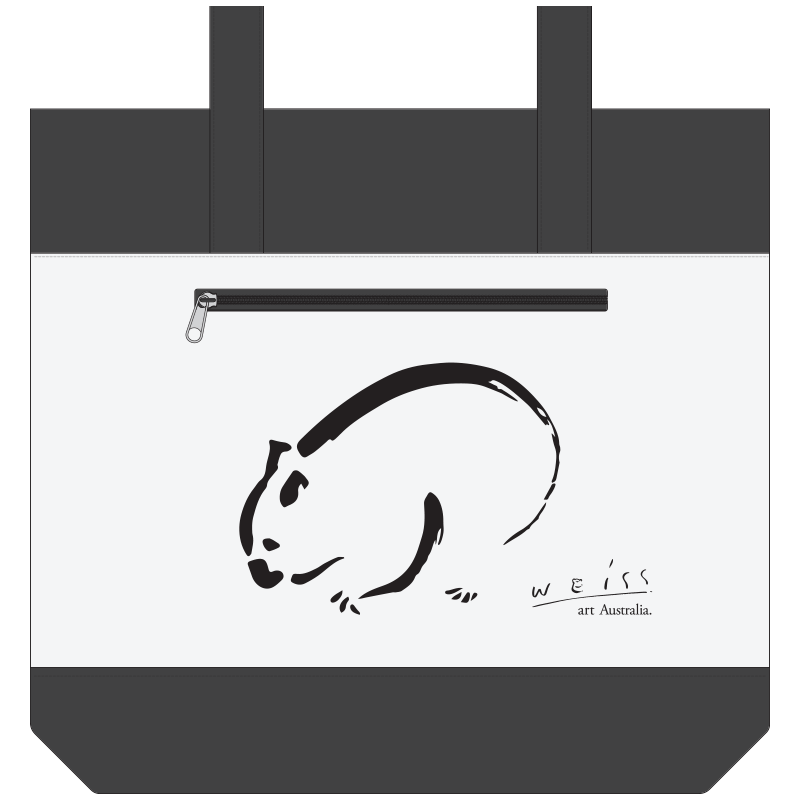 Weiss art Wombat Tote Bag, iconic calligraphy design on a practical beach or travel tote bag. Smart two-tone bag with a rounded gusset and a sewn in base for added capacity. Tough 600D polyester with a zippered front pocket, a secure zippered top closure and long woven carry handles so it can be comfortably carried on a shoulder.